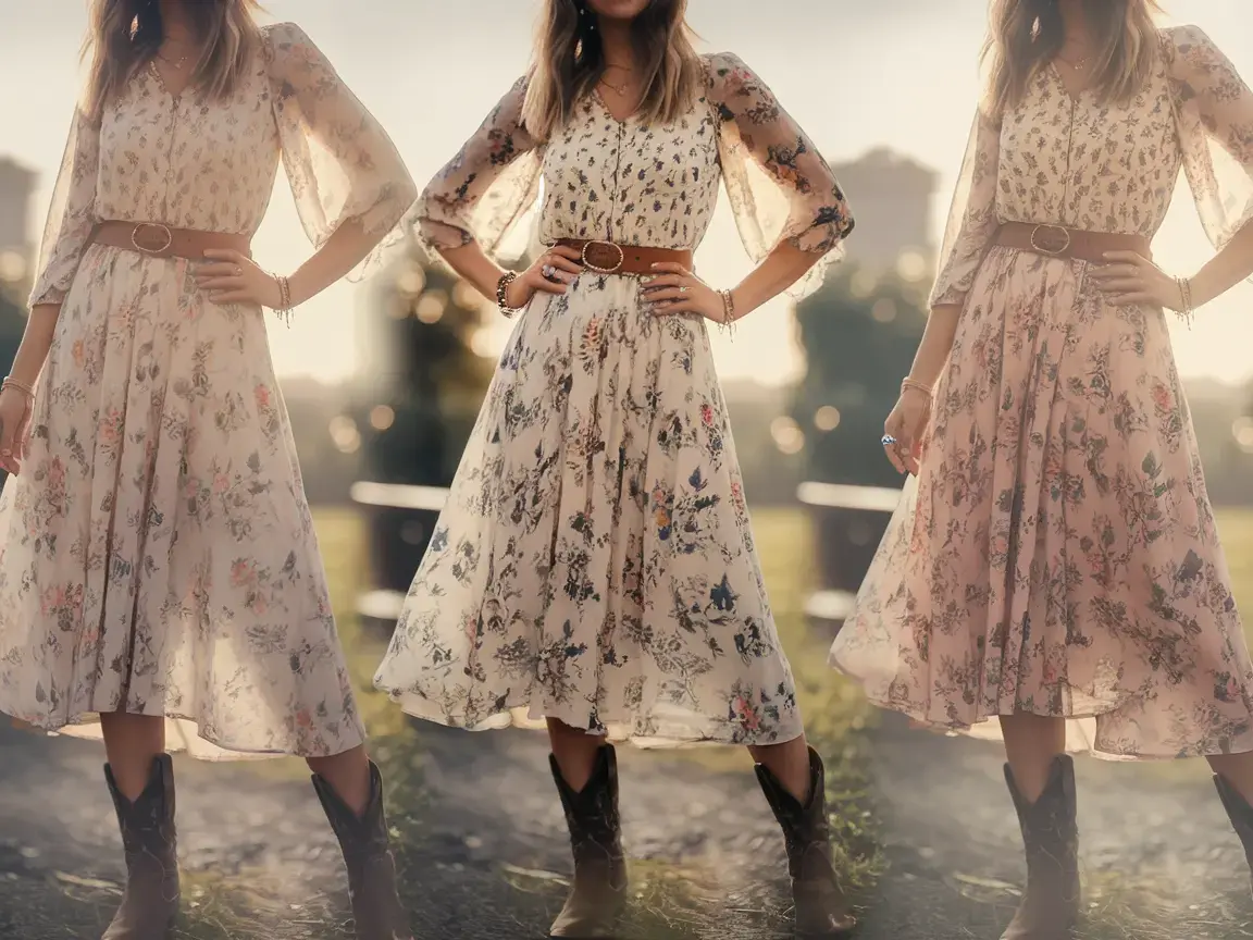 Floral dresses soften the boldness of cowboy boots, making this a perfect mix of feminine and country chic.