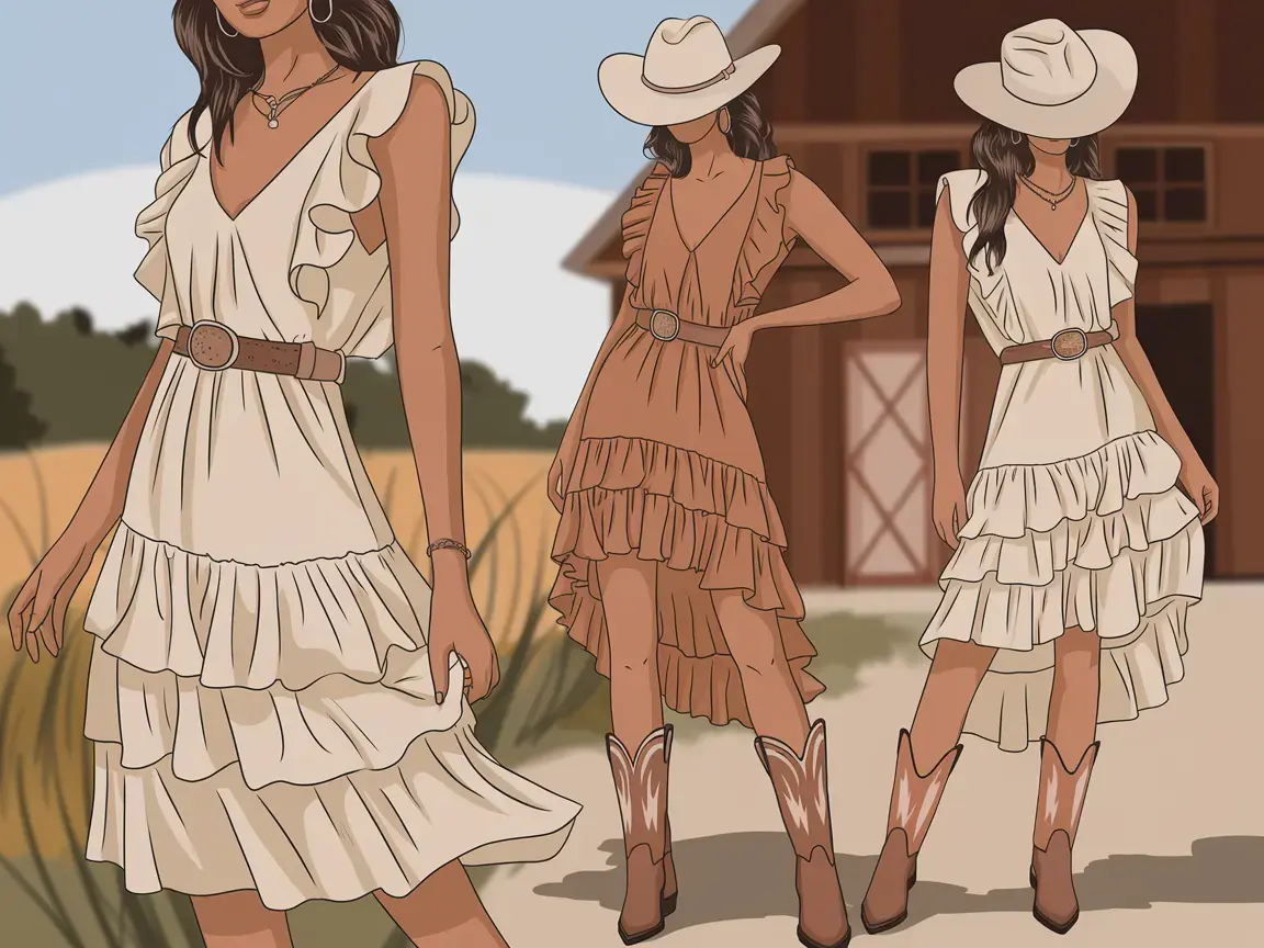 Ruffles add a soft, romantic feel that pairs beautifully with cowboy boots. Whether it’s subtle tiered ruffles or dramatic layers, this style blends femininity with a Western touch.
