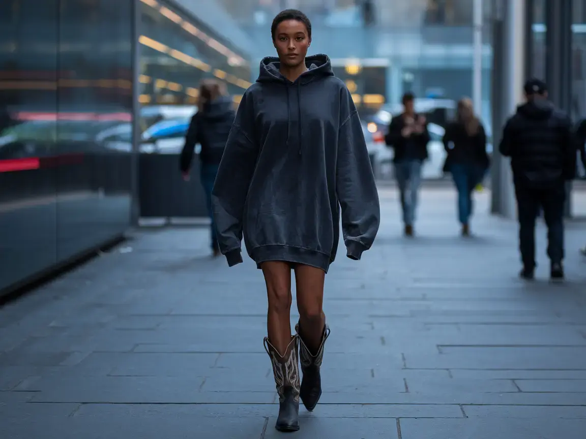 Mixing streetwear with Western fashion creates an effortlessly cool outfit. A hoodie dress with cowboy boots is unexpected yet trendy.