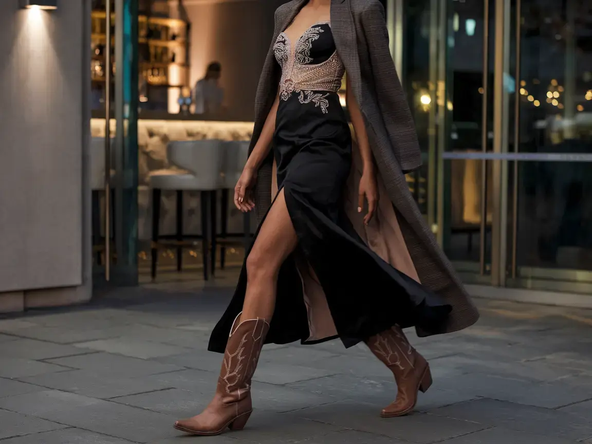 Pairing a cocktail dress with cowboy boots is a bold fashion move that works beautifully for date nights or semi-formal events.