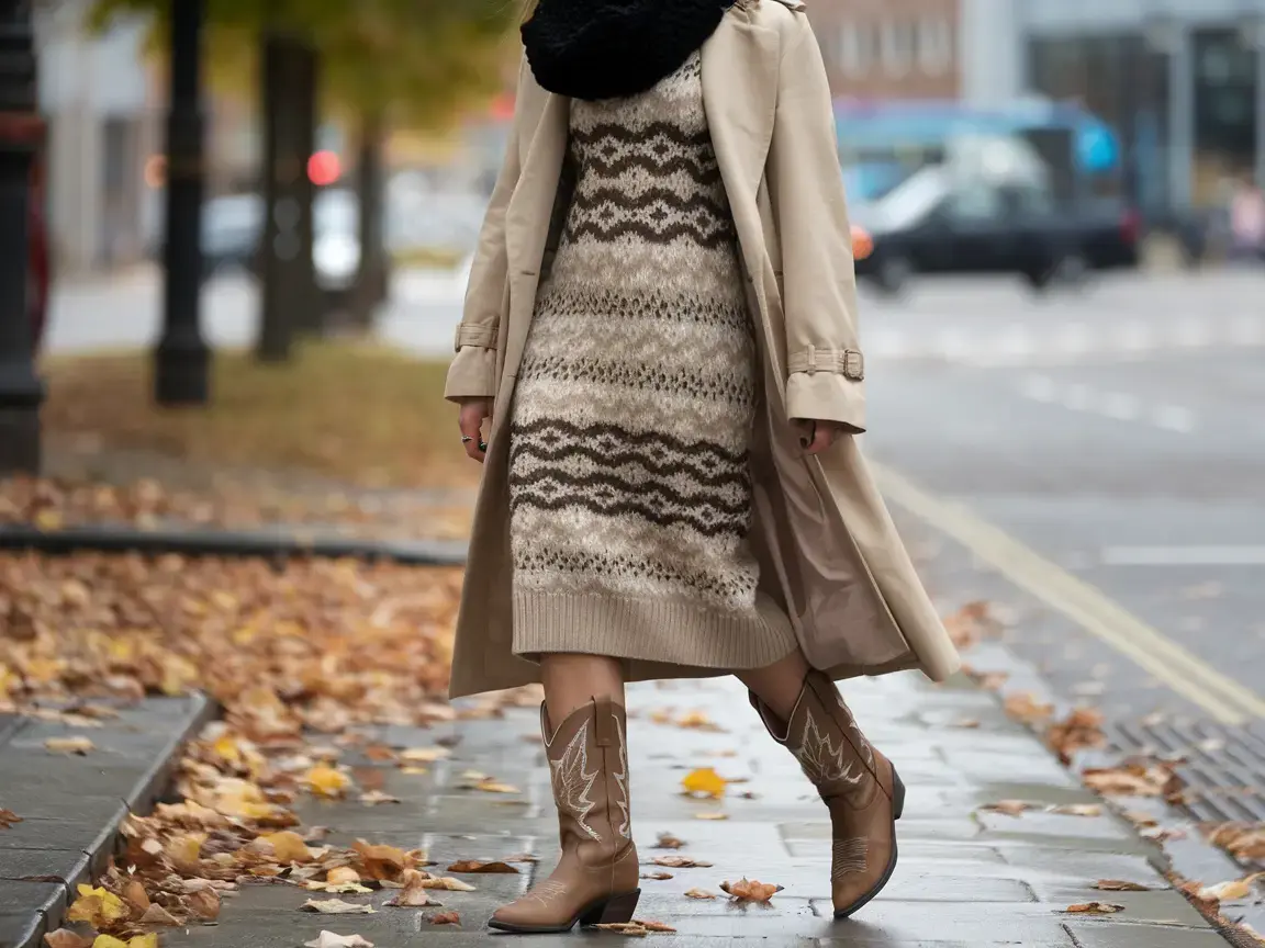 A sweater dress paired with cowboy boots is the perfect fall and winter outfit. Soft, warm, and stylish, this combination works well with knee-high or ankle cowboy boots. Layer it with a trench coat or a chunky scarf for an extra cozy feel.