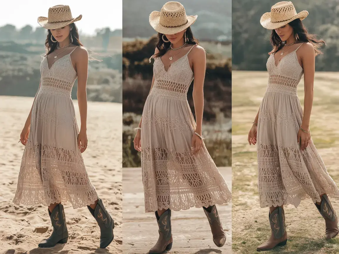 A crochet dress offers a light, breathable option that works perfectly with cowboy boots. This look is ideal for summer events, beach outings, or country vacations.