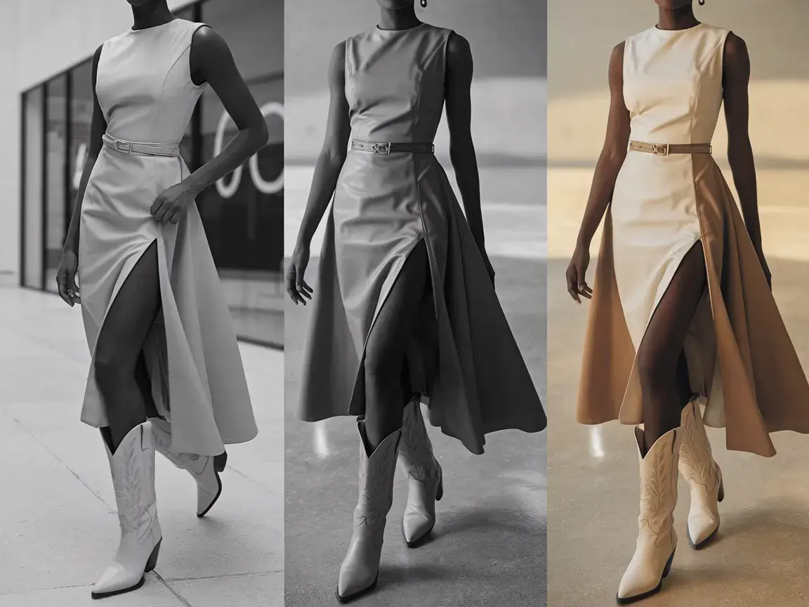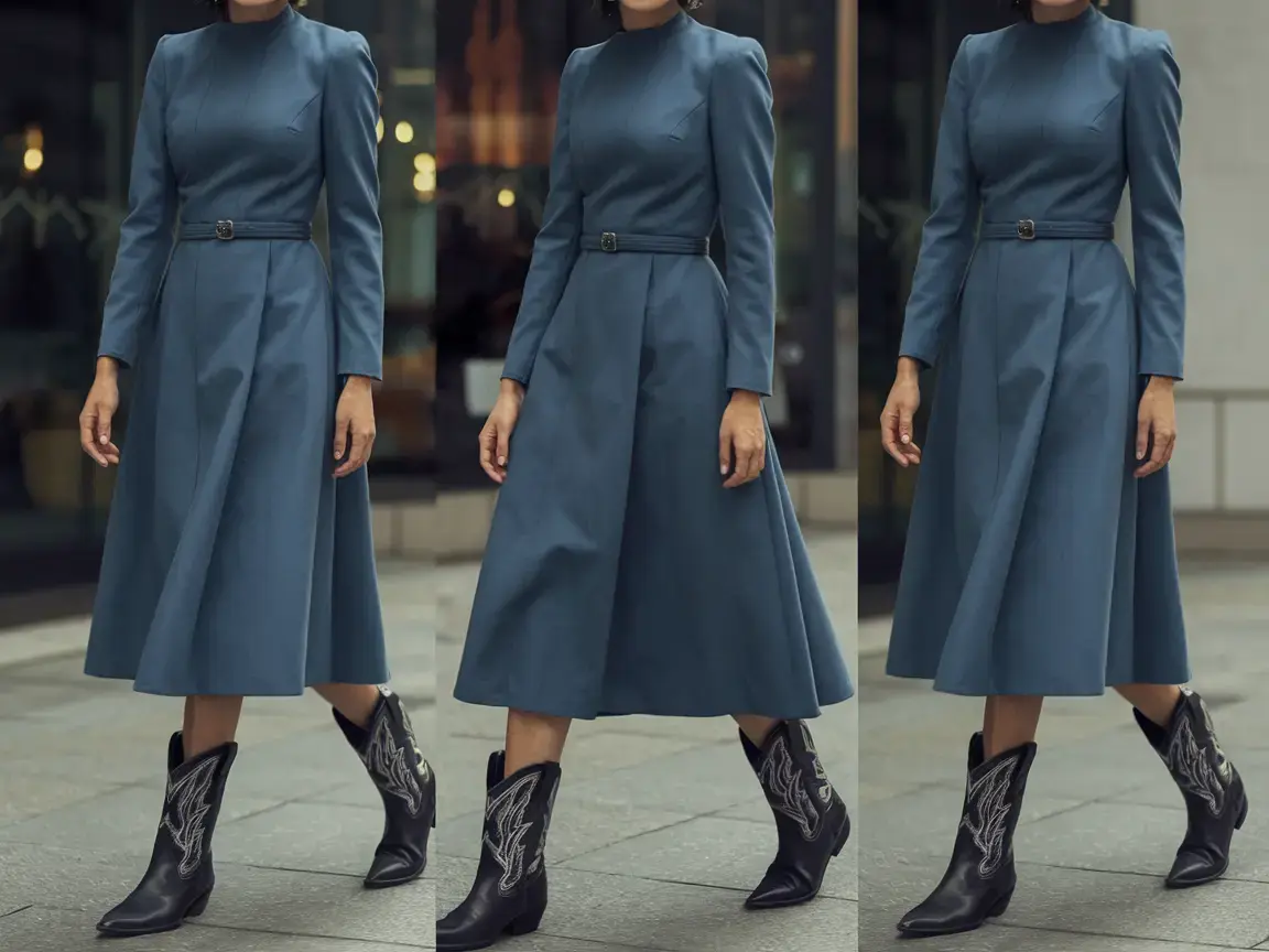 A structured midi dress with cowboy boots creates an effortlessly chic look. This polished yet edgy combination works well for semi-formal occasions, meetings, or even an elevated street-style look.