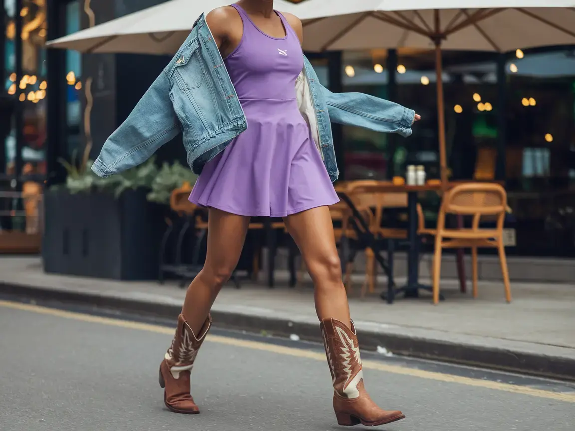 Blending sporty and Western styles, a tennis dress keeps things playful. The short, flared silhouette contrasts nicely with the boots. Add a denim jacket for an extra layer of style.
