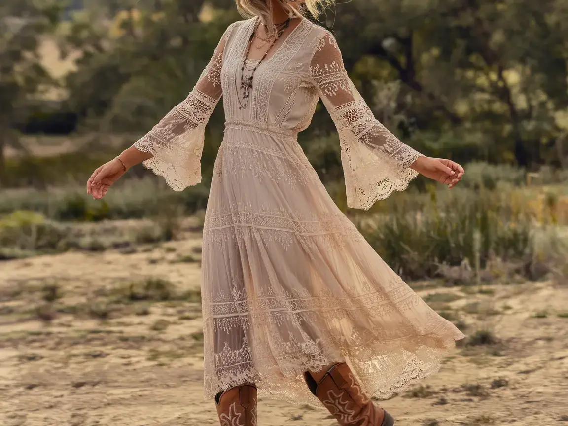 Lace dresses bring a soft, vintage feel to Western-style outfits. Whether white, beige, or pastel, lace pairs beautifully with rugged boots for a balanced look.