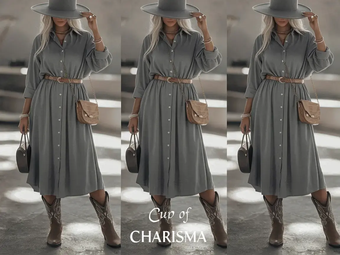 A button-down shirt dress paired with cowboy boots offers an effortlessly cool outfit. Whether oversized or cinched at the waist, this look is comfortable yet stylish.